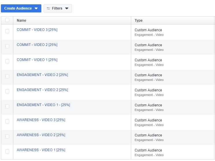 SET UP YOUR CUSTOM AUDIENCES IN THE FACEBOOK MANAGERS DASHBOARD - ONE FOR EACH VIDEO OR PUT 3 VIDEOS IN EACH OF THE PHASE AUDIENCES -